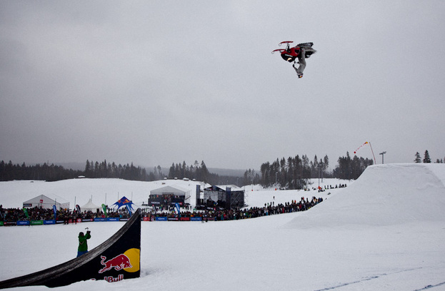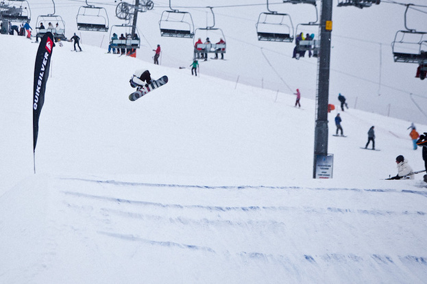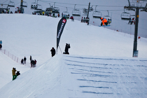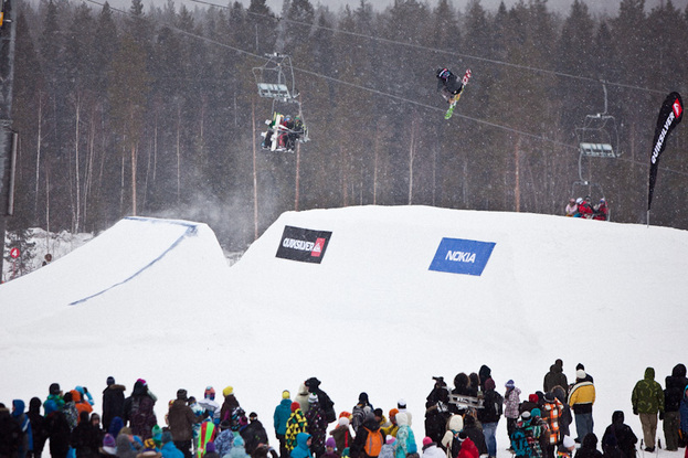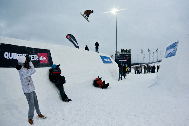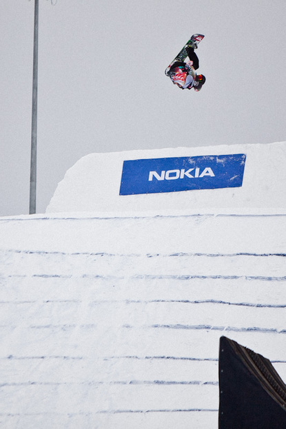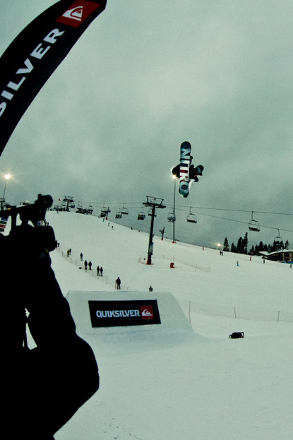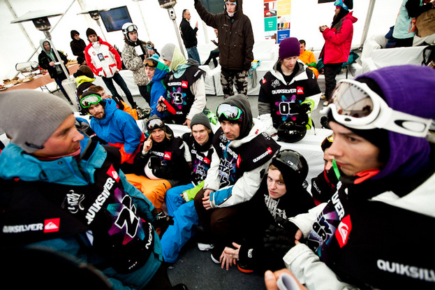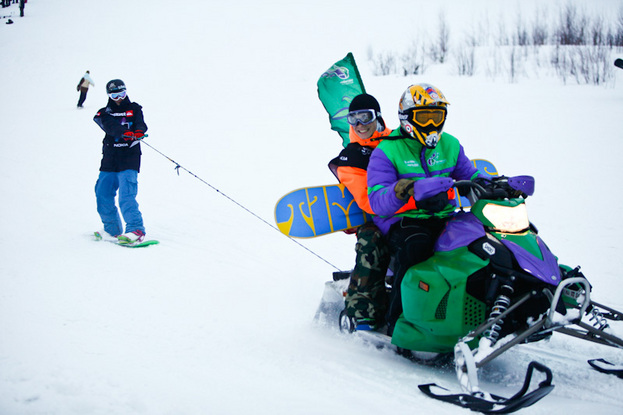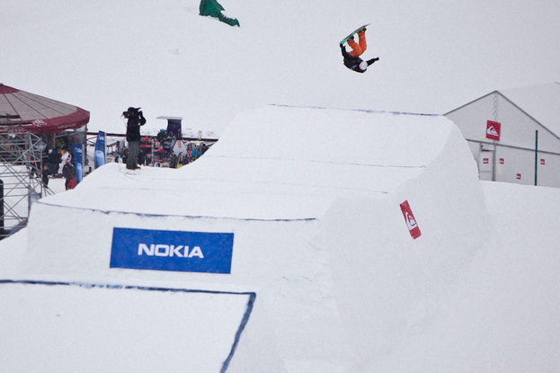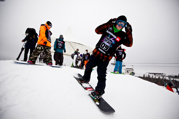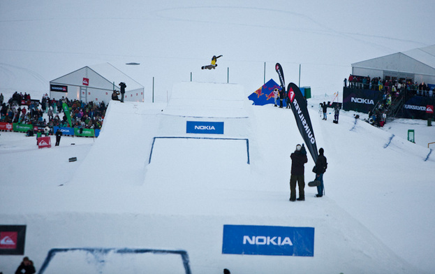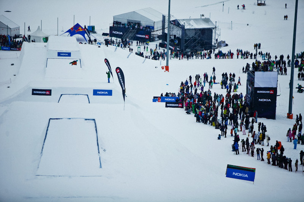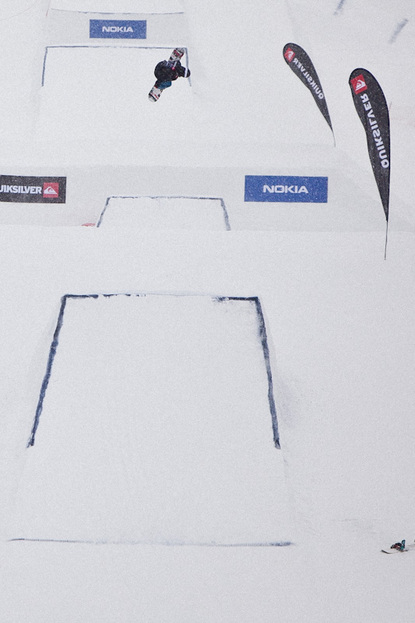 Снегоходы от Мегафона курсируют снизу вверх и поднимают участников, судьи заняли позиции на судейской вышке, кикеры размечены – все готово к началу квалицикационных заездов. Из российских райдеров лучше всех смотрелись Сергей Лапушкин и Юра Гаврилов, однако в финал вышел только Лапушкин, занявший 10е место в квалификации. Больше всего судьям запомнился австриец Маркус Петцл, который выстегивал крепление перед последним прыжком и делал one foot на ритм-секции, но, к сожалению, ему не хватило баллов выйти в финал. По словам судей и по правилам судейства слоупстайл-контеста больше баллов получал тот, кто показывал хорошую связку в серию.