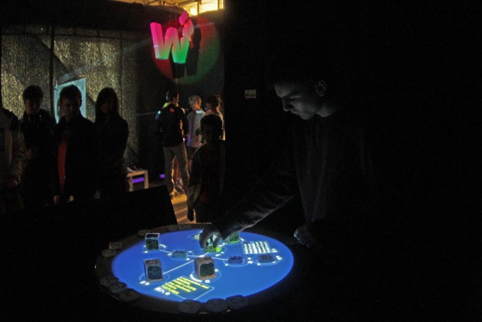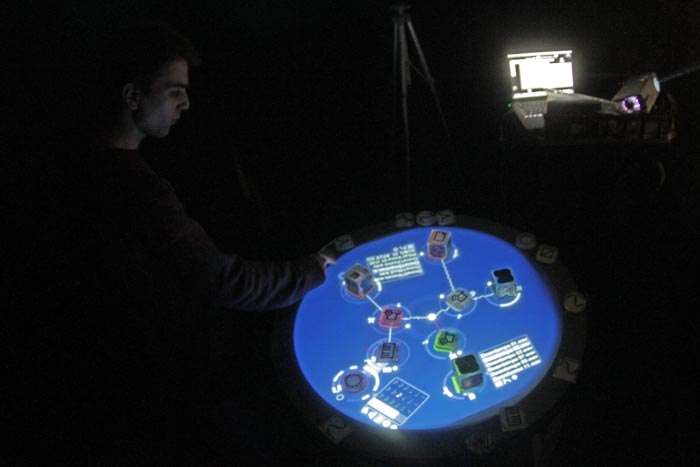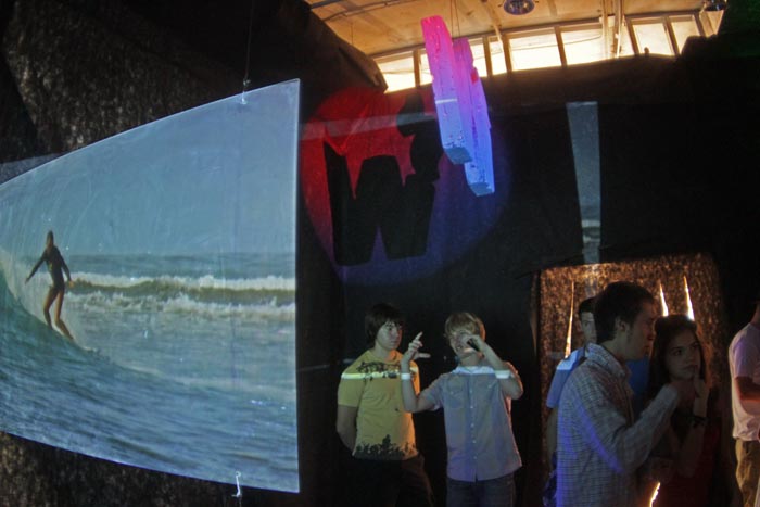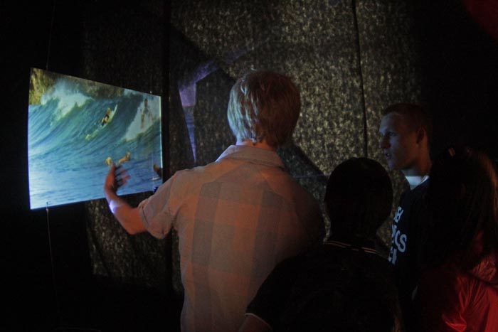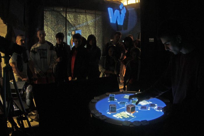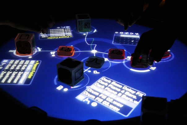 Еще раз напомним вам, что мы делали стенд совместно с Hyparxis, концепцией нашего стенда было совмещение аудио и видео ряда с технологиями будущего. Можно было посмотреть наше видео на голографической панели, переключая различные видео при помощи маркеров, сноуборд и серф тематики. Вы смогли поиграть на электронной арфе, а также послушать, а главное посмотреть игру диджея на Reactable.