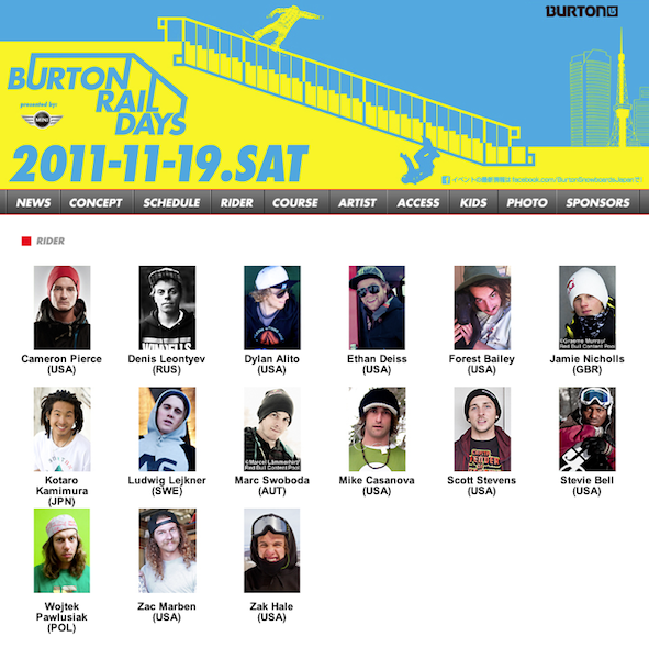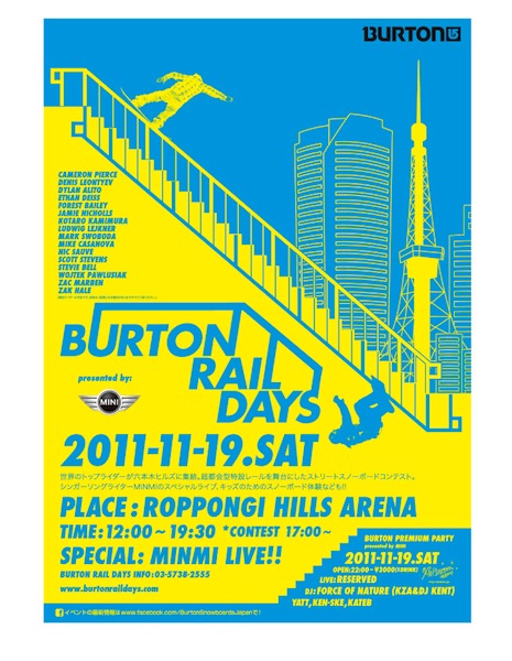 Хотим напомнить вам, что уже совсем скоро, 19 Ноября, 2011 в Токио в новом районе Roppongi Hills состоится крупный контест Burton Rail Days при поддержке MINI. Этот ивент дает всем любителям сноубординга уникальный шанс посмотреть на лучших джиб райдеров Земли и насладиться выступлением MINMI - 1-го исполнителя из Азии, который был номинирован Soca Awards в Нью-Йорке как "Прорыв года" в 2006 году.