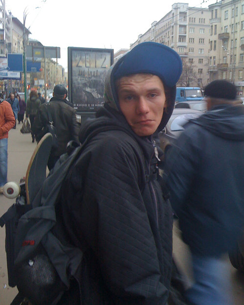"Вчера мы с Копчиком (Димой Кольцовым) были на Курской, проходили диспанцеризацию (требования нашей любимой школы РГШ). Просидев там около трех часов и пройдя трех врачей, поняли, что пора уходить.На обратной дороге решили зайти в Атриум попить кофе, у Копчика был с собой скейтборд, прикрепленный к рюкзаку, так как после этого он ехал в скейт-парк.