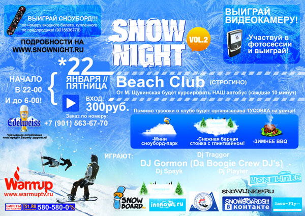 22 января состоится долгожданная вечеринка Snow Night-2, продолжение серии уникальных вечеринок для любителей сноуборда! На этот раз мы отрываемся в Beach Club! Внутри клуба, как всегда, треш на танцполе под сеты ваших любимых диджеев! Зажигательные живые ритмы барабанщиков на там-тамах, тематические фотосессии. На улице же вас ждет выступление прорайдеров в специально оборудованном мини сноуборд-парке. Там же вы сможете показать свой Freestyle. Лучших ждут ценные призы! На свежем воздухе к вашим услугам: снежная барная стойка, глинтвейн, барбекю и каток.