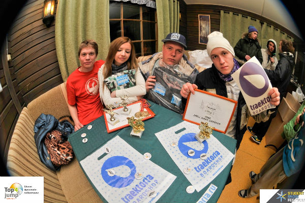 В финальный день вечером состоялось чествование победителей всех контестов и отличившихся во время фестиваля. Победители получили памятные награды: кубки, сертификаты от Top4jump и призы от наших друзей, магазинов Траектория и B-shop. Закрытием фестиваля стала шумная и диковатая вечеринка, на которой все веселились не жалея сил. Так что на утро участники фестиваля только к 12-13 часам пришли в себя. Огромное спасибо начальникам склона в Золотой Долине Дмитрию и Андрею за их огромную помощь и всему персоналу ГЦ Золотая Долина за понимание и терпение!