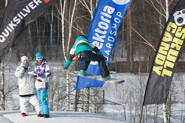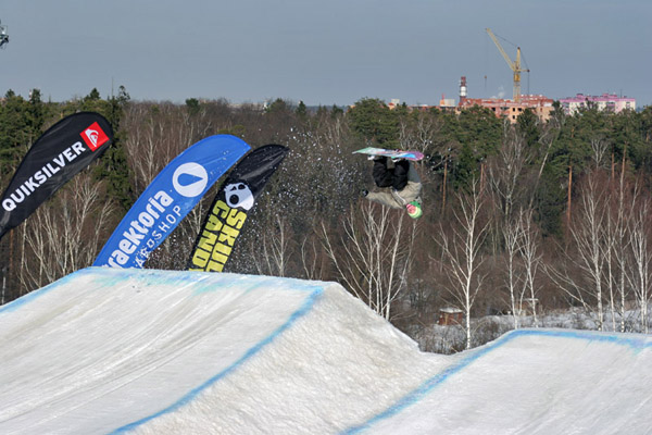 Далее выступали парни в дисциплине new school. И вот тут развернулась нешуточная борьба. Лучшие серии показали: Евгений Ветошкин со связкой 540 + sw720 и один из братьев Сучковых с серией cork720 и cork900. Так же не остались незамеченными попытки на 900 от команды «Пирожки».