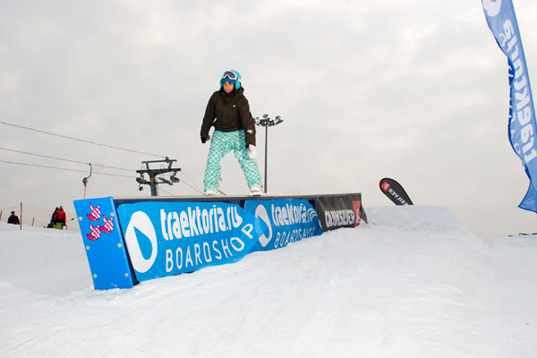 Среди девушек борьба разгорелась между Алиной и Светой. Алина сделала упор на сложные трюки (sw fs на 50-50 fs out) по launch боксу, Света – на стабильность, проезжая всю линию чисто и аккуратно.