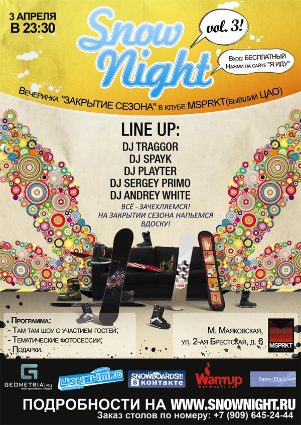 3 апреля состоится вечеринка Snow Night vol. 3 в честь закрытия сноуборд сезона, продолжение серии уникальных вечеринок для любителей сноуборда! На этот раз мы отрываемся в клубе МосПроект (бывший ЦАО)! И как бы не было нам грустно прощаться с уходящим зимним сезоном 2010, это должно было когда-нибудь произойти. Не будем унывать!!! Тусовки еще никто не отменял! Проводим уходящий сезон шумно и бурно: