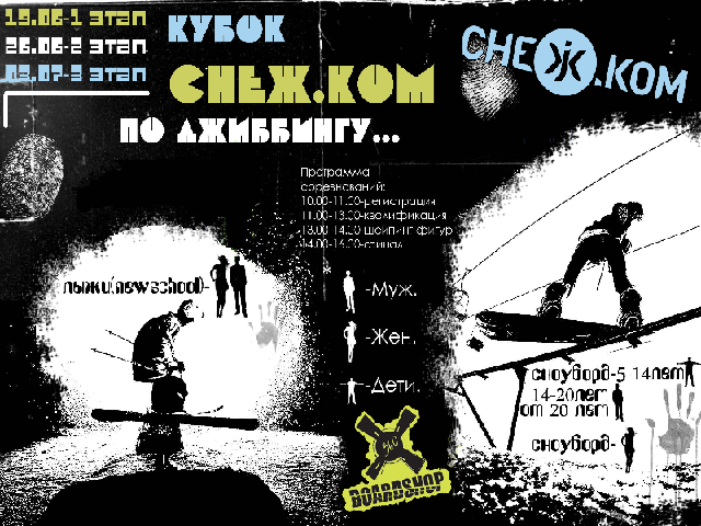Кубок СНЕЖ.КОМ по джиббингу 19 июня во Всесезонном горнолыжном комплексе СНЕЖ.КОМ при поддержке компании 360boardshop пройдет 1-ый этап Кубка СНЕЖ.КОМ по джиббингу среди сноубордистов и лыжников. Соревнования проводятся в личном зачете, к участию приглашаются все желающие сноубордисты-любители и лыжники. Возрастные группы: • с 5 до 14 лет – мальчики (сноуборд) • с 14 до 20 лет – мальчики (сноуборд) • с 20 лет – мужчины (сноуборд) • без возрастных ограничений – девушки (сноуборд) • без возрастных ограничений – мужчины, женщины (лыжи) Соревнования проходят в три этапа: • 1 этап 19.06.10 • 2 этап 26.06.10 • финал 03.07.10 Победители и призеры каждого этапа соревнований награждаются подарками от компании 360boardshop. Победители финала соревнований награждаются подарками от компании 360boardshop, грамотами и подарочными сертификатами от ВГК СНЕЖ.КОМ. Правила проведения и требования к участникам соревнований. Заявки на участие в соревновании от лиц не старше 18 лет принимаются при наличии письменного «Согласия», заполненного двумя родителями, по установленной форме, при непосредственной регистрации, справки из лечебного учреждения об отсутствии противопоказания участия в соревновании по сноуборду или горнолыжному спорту, при наличии действующего страхового полиса от несчастного случая и свидетельства о рождении ребенка. Каждый участник соревнований, при регистрации оплачивает в кассе комплекса, до начала соревнования, стоимость ски-пасса на время соревнований - 700 рублей и стартовый взнос в размере 200 рублей. Участники соревнования моложе 18 лет допускаются к старту при наличии страхового полиса и защитной экипировки (шлем – обязательно; защитные шорты, защита спины, защита рук - рекомендуется). Главный судья соревнований - Гаврилов Юрий работник службы инструкторов Горнолыжного центра СНЕЖ.КОМ.