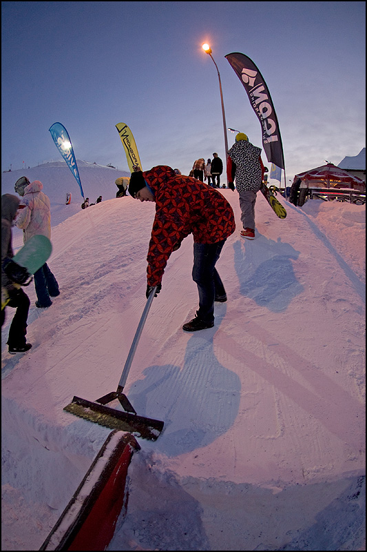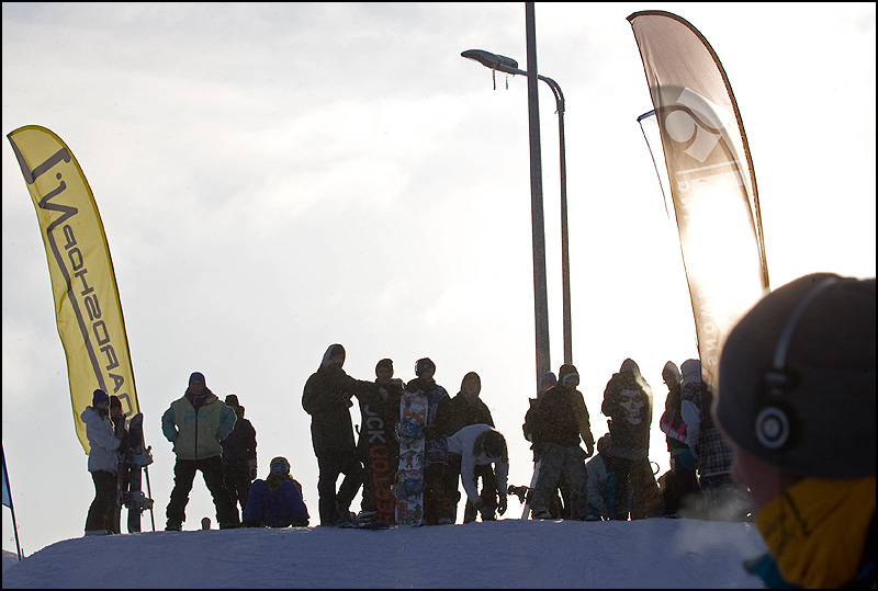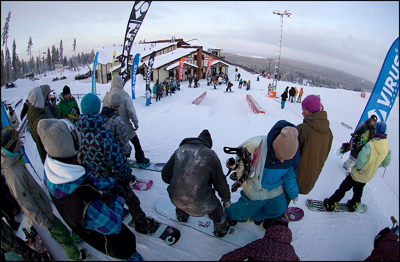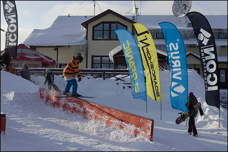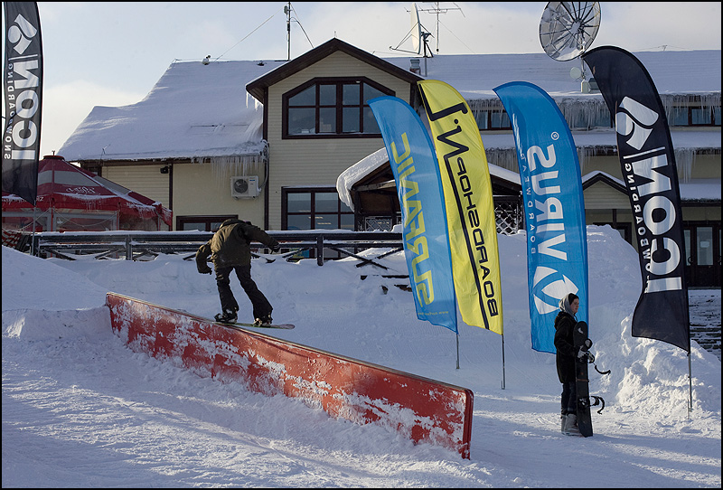 Самых морозостойких джибберов ждал специальный спот на «пятачке» возле бистро. Наклонный бокс и наклонный рейл участники начали обкатывать задолго до официальной части соревнований, так и только так можно было не превратиться в ледяную глыбу в ожидании начала квалификации. Участников собралось не так много, как мы ожидали. Помимо локальных пациентов, мы предполагали увидеть и москвичей. И они, конечно же, появились, но в неожиданно малочисленном составе. На регистрацию народ не валил, собирались не спеша. Кто-то вообще так и остался тренироваться в парке, проигнорировав контест. В очередной раз порадовали девушки, подавившие своим количеством ньюскул меньшинство, представленное доблестной, всем знакомой, пятеркой (Ануфриев, Цюх, Фузееич, Кенсман, Нургалиев). Видимо, Санкт–Петербург перестает быть Меккой Российского new school, что не добавляет нам радости.