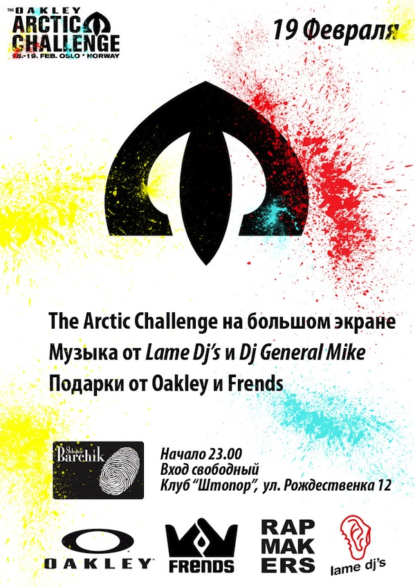 19 февраля в далекой Норвегии состоится одно из самых крупных событий в сноуборд жизни Европы - The Oakley Arctic Challenge 2011. Мы приглашаем вас вместе поболеть за любимых райдеров в клуб «Штопор». Битву лучших «про» мира за место в рейтинге TTR и хорошие призовые весь вечер можно будет наблюдать на экранах клуба. В этот холодный вечер своими пластинками вас будут развлекать Lame Dj's и Dj General Mike (RAPMAKERS). Для самых ярых болельщиков Oakley и Frends приготовили специальные подарки.