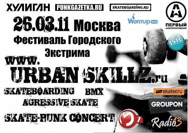 Пришло время взорвать город беспредельной Энергетикой городского Экстрима! 26 марта 2011 года, в помещении скейт-парка Адреналин, город Москва, состоится уникальное событие!Фестиваль Городского Экстрима "Urban SkillZ"!!!