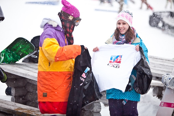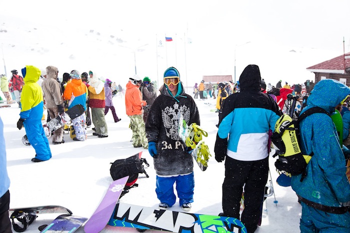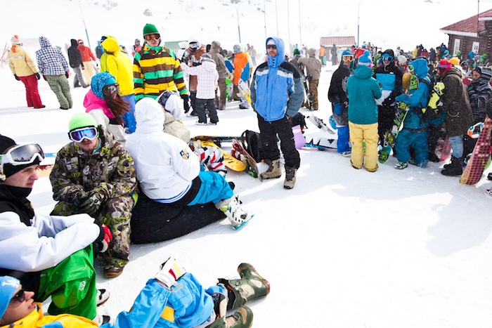 Однако, несмотря на все погодные невзгоды, парк и чилл-аут собрал толпы участников, которые тут же выстроились в очереди за карточками и скипассами. Немалую очередь собрали и подъемники, у которых периодически слетали тросы из-за аномального ветра. Баннеры и флаги рвало пополам, подъемники вставали, но многих это не останавливало: неработающие швабры – не проблема, если можно подняться наверх пешком. Джибберы зависают в верхней железной части парка, любители кикеров доезжают донизу – при взгляде на склон и не скажешь, что в парке бушует метель.