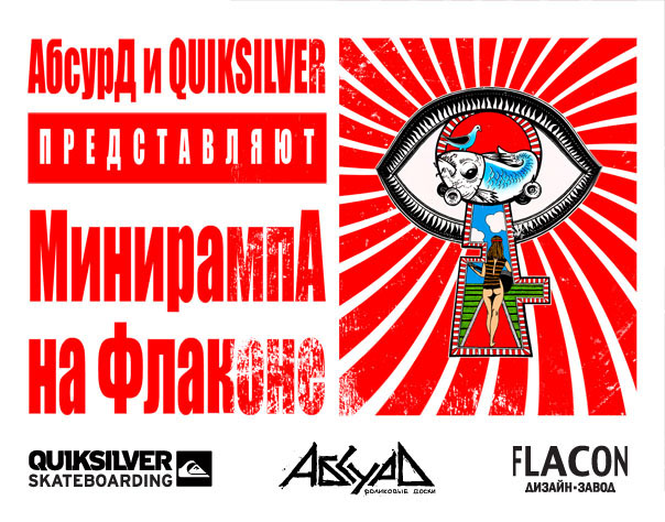 Роликовые доски Абсурд и компания Quiksilver представляют мега-мини-рампу на дизайн-заводе «Флакон». Красная, многоуровневая красавица с «печкой» и «волной» - отличное место для катания и тусовок с единомышленниками.