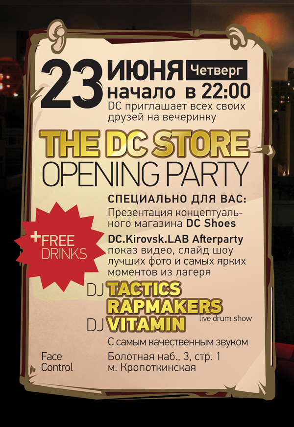 Ну а накануне, вечером 23 июня (четверг) мы приглашаем всех на «The DC Store opening party», которая пройдет в клубе «Rolling Stone». Музыкальное настроение будут создавать Dj Tactics, RAPMAKERS Live Drum Show и Dj Vitamin.