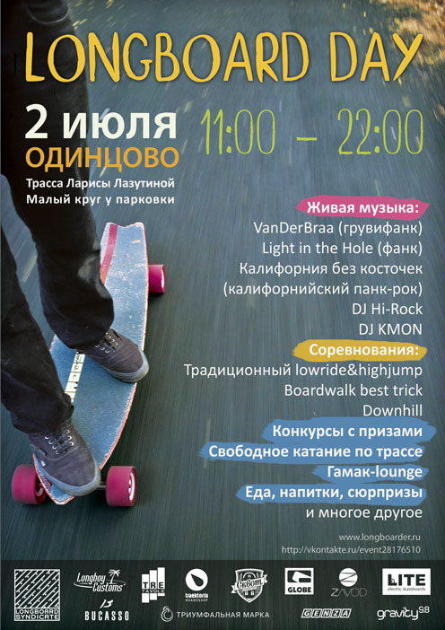 Этим летом, 2 июля выбирайтесь за город под палящее солнце, на горячий асфальт трассы в лесу Одинцово, где уже в 4-й раз пройдёт фестиваль длинных досок, музыки и лета LONGBOARD DAY 2011! Вы сможете поучаствовать в соревнованиях, послушать живые выступления групп, покататься с друзьями и получить океан хорошего настроения!
