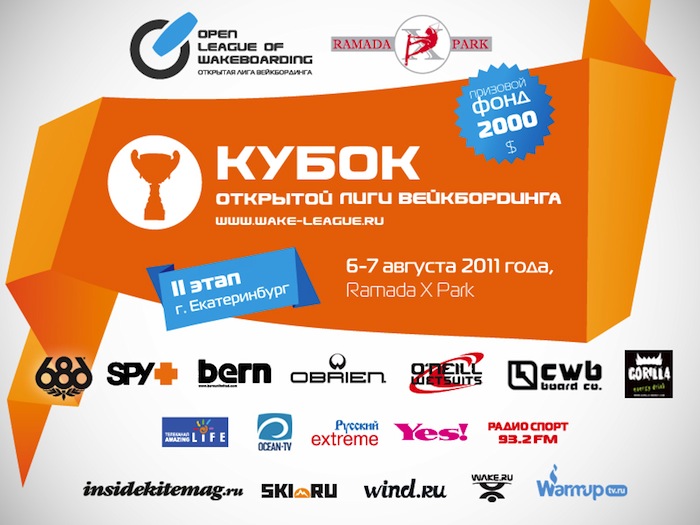 Кубок Открытой Лиги Вейкбординга 2011 года, продолжает свой тур по России, второй этап, как и было обещано, пройдет 6-7 августа, в Екатеринбурге, на территории «Ramada X Park» с лучшими фигурами от компании UNIT. Вас ждет два дня вейкбордических соревнований, море положительных эмоций, хорошая музыка, призы и подарки от спонсоров, и самое главное - это 2000$, которые достанутся победителям.