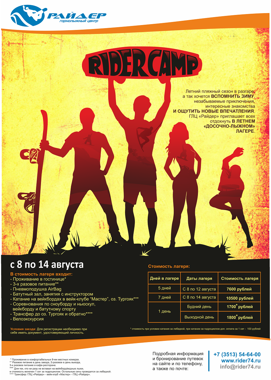 RIDER summer camp – это зима и лето в одном месте, ГЛЦ «Райдер», где можно встретить старых друзей и завести новых, получить удовольствие от прыжков на сноуборде и горных лыжах в пневмо-подушку air-bag с трамплина, разгоняясь по искусственному покрытию, получить здоровый загар катаясь за лебедкой или гидроциклом на вейкборде или водных лыжах в вейк-клубе «Мастер» на озере Тургояк, вспомнить и узнать технику прыжков в батутном зале и просто отдохнуть в комфортабельных номерах гостиницы ГЛЦ «Райдер».