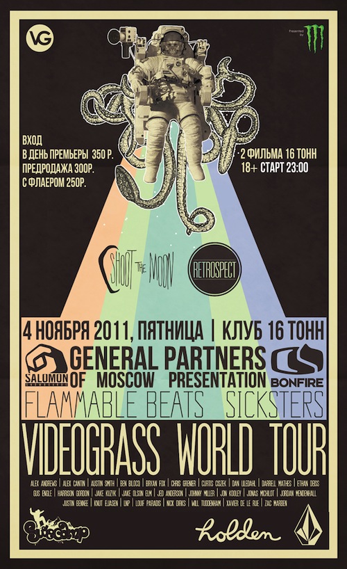 4 ноября 2011 года в Москве пройдет премьера фильмов о сноубординге "Shoot the Moon" и "Retrospect"от известной студии Videograss (vgsnow.com) при генеральной поддержке Salomon и Bonfire, которые приложили немалые усилия к съемкам самих фильмов.
