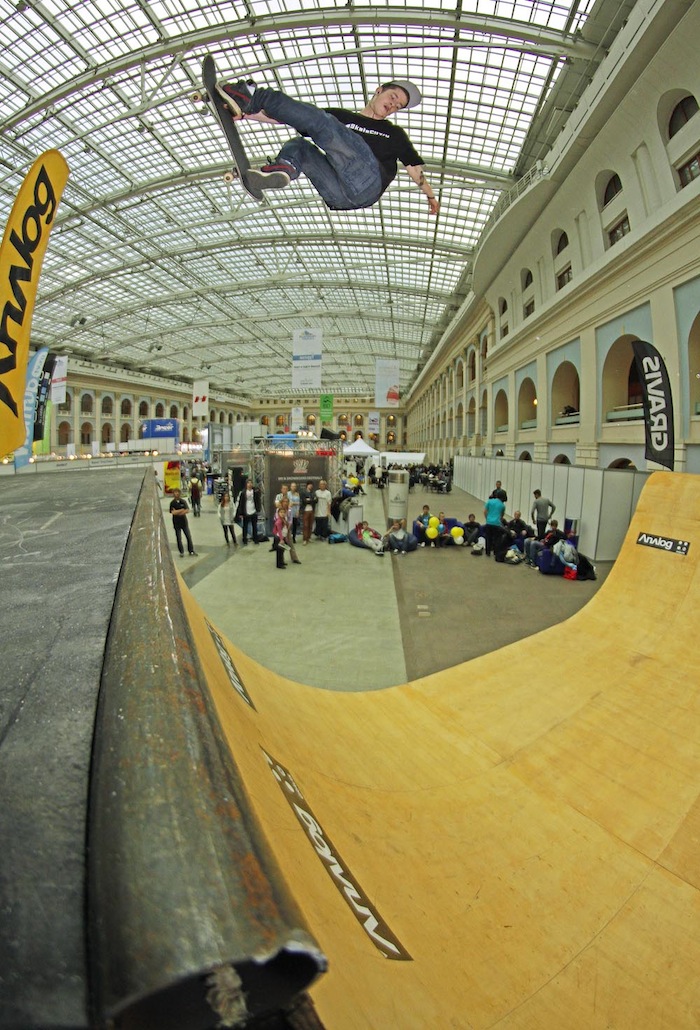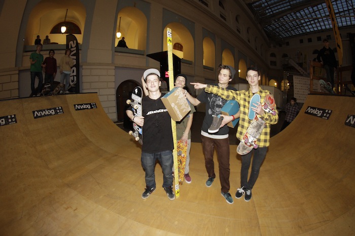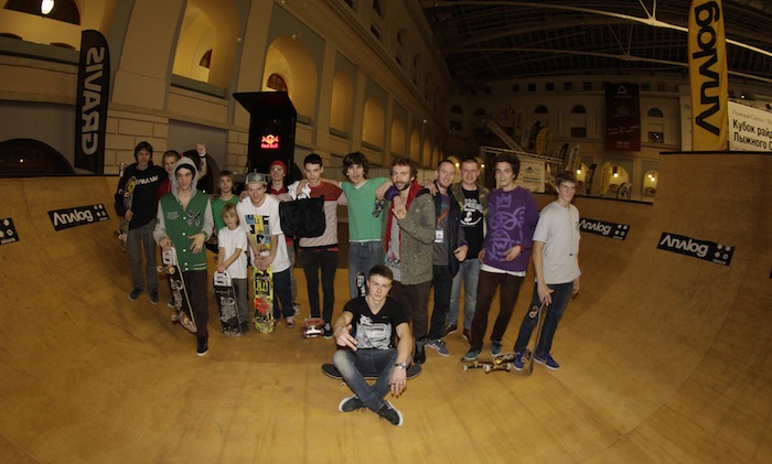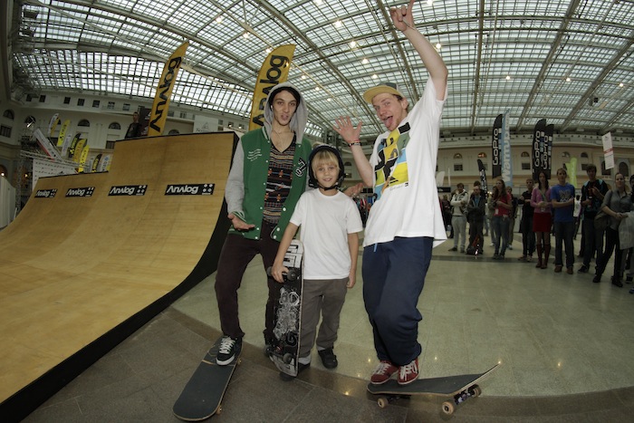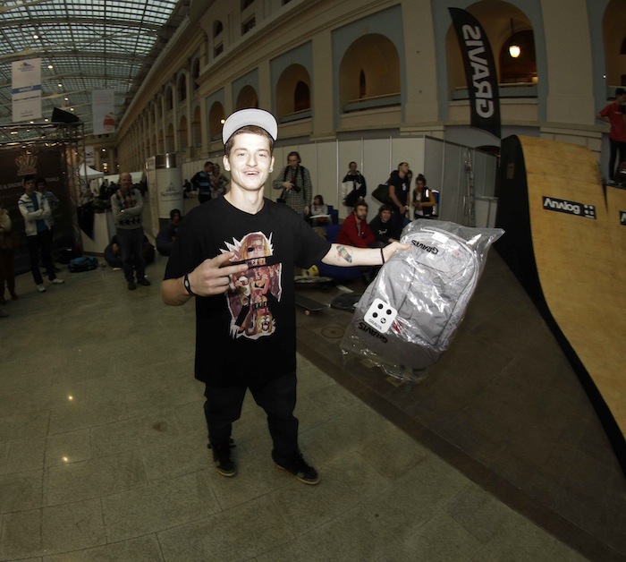 Итак, в первый день работы выставки прошел любительский Gravis Jam. Приехали почти все фанаты рампового катания, а также те, кто просто хотел попробовать себя на новом поприще. Стоит отметить, что мидирампа оказалась на высшем уровне, как и полагается у SkateCity. Ведущий и главный по призам был самый позитивный человек, олдовый скейтер, аюрведический повар, да и просто йог - Юра Руль! Так как призов было очень много, джем шел около 2х часов, в итоге очень многие показали не только хороший уровень, но и сделали совсем новые для себя трюки. Стоит отметить катание Димы Бравичева, Давида Газиева, Димы Кольцова, Алишера Садыкова, Саши Попова и других, но особенно запомнился маленький скейтер - Андрей, лет шести, которому также достался подарок от Analog.