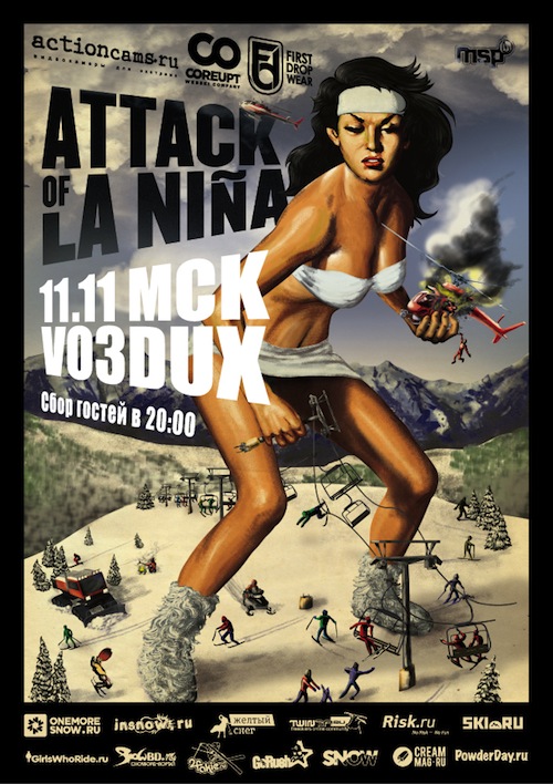 11 Ноября в Московском клубе "Воздух" состоится двойная премьера freeski видео: Attack of La Nina от MSP и “Nothing Else Matters” от Legs of Steel.