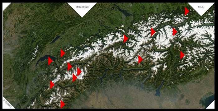 Интерактивная мультимедийная карта Альп, на которую нанесены 13 курортов. Выбор каждого из них не случаен, предлагаем убедиться самостоятельно. В числе этого