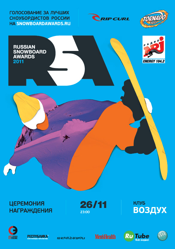 По завершению голосования, 26 ноября в клубе «Воздух» пройдет вечеринка Церемонии награждения победителей Премии. Помимо вручений кубков RSA 2011, гостей развлечет музыка от Lame Djs розыгрыши и подарки от партнеров. Ведущий церемонии — Андрей Пирумов — профессиональный сноуборд-фотограф, главный редактор журнала «Доски», Dj Pirumov (Flammable Beats).