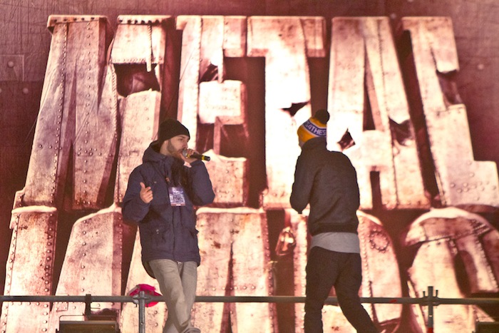 С 17:00 на площадке уже играла музыка: вечер открыл практически бессменный участник московских сноуборд-ивентов DJ Tactics (Flammable Beats), под чей зажигательный хип- хоп прибывающие гости понемногу проникались соответствующей атмосферой. По периметру расположились точки горячего питания и напитков, павильон для прессы и карета скорой помощи. Сидевший на передних сидениях медперсонал был живо заинтересован происходящим на сцене, на которой в 18:00 началось основное действие – первая отборочная джем-сессия. Ведущий Артем Хворостухин рассказывал зрителям о том, как велась подготовка к ивенту, об участвующих в нем райдерах и о том, что вообще такое джибинг (ивент посетило в общей сложности около двух тысяч человек, среди которых было немало тех, кто, возможно, впервые в этот вечер вживую увидел сноубординг).