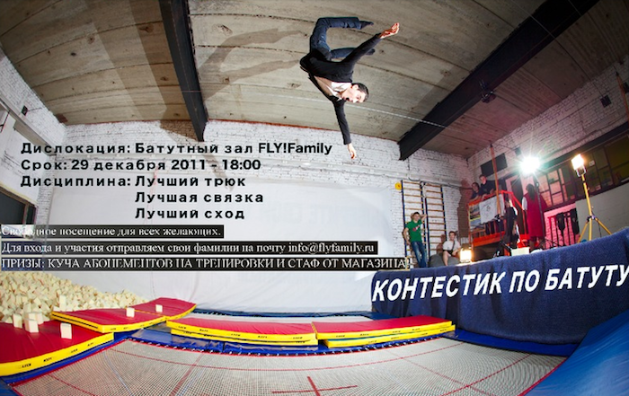 29 декабря в батутном зале Fly Family состоится первый контест на батуте среди всей экстремальной тусовки Москвы, а возможно и не только столицы.