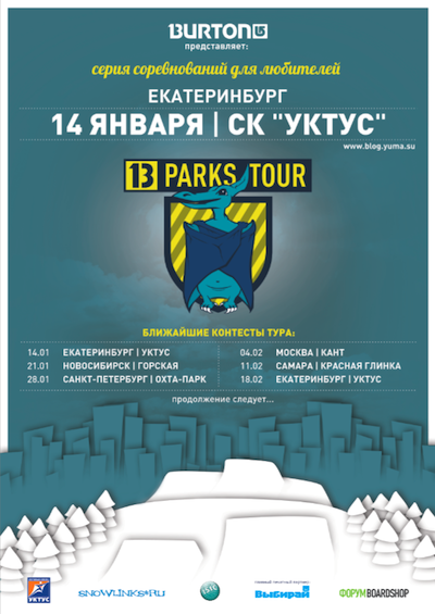 Именно поэтому Burton представляет 13 Parks Tour – серию из 13 контестов, которые пройдут в разных городах России в этом сезоне.
