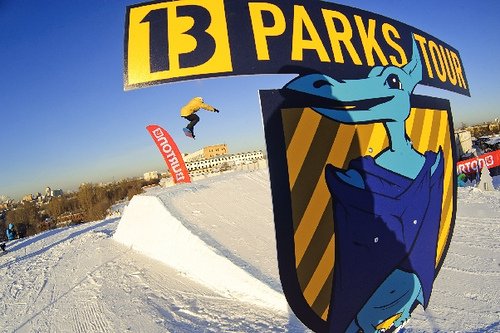 Конечно, многие участники соревнований еще не успели достаточно потренироваться в этом сезоне из-за отсутствия подходящей площадки, поэтому трюки были не слишком сложными. Но начиная с 30 января парк открывается для всех желающих и будет работать в режиме спорткомплекса КАНТ с 10:00 до 23:00. Так что теперь у всех будет достаточно времени, чтобы хорошо подготовиться перед вторым московским этапом Burton 13 Parks Tour, который состоится 10 марта. В перерывах между попытками райдеры и многочисленные зрители могли насладиться вкусными сосисками, пожаренными на Burton-гриле, и послушать приятную музыку. Особого внимания заслуживает брендинг, установленный в парке. В лучших традициях европейских и американских курортов, прямо на склоне были установлены большие красивые буквы с надписями 13 Parks Tour и символ соревнований - сине-зеленый птеродактиль.