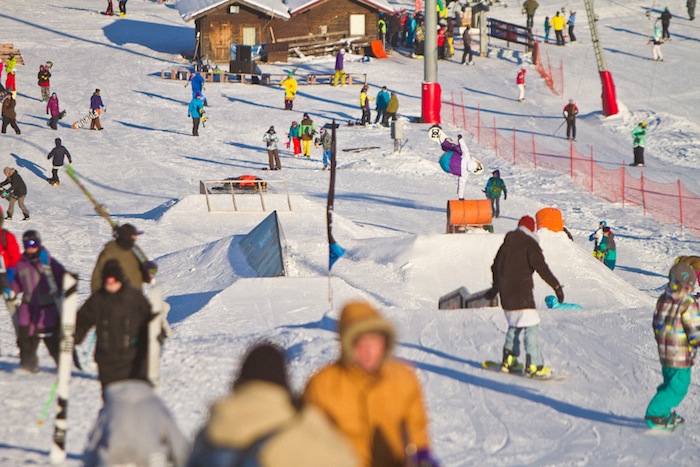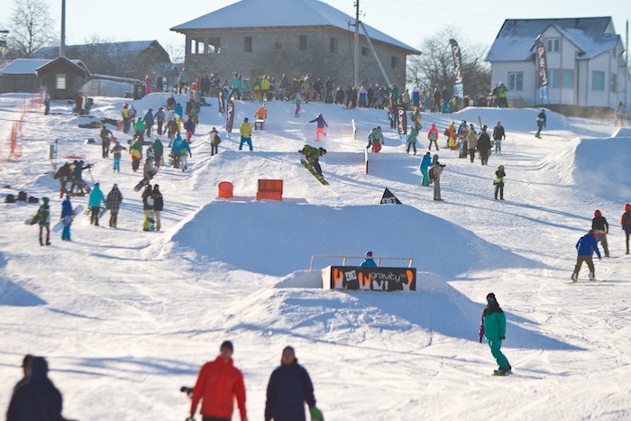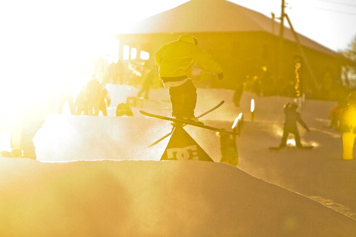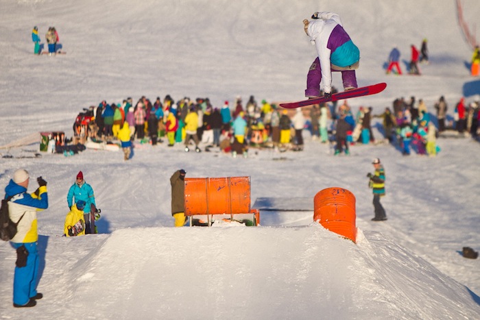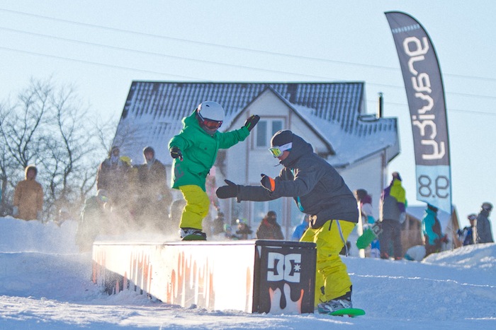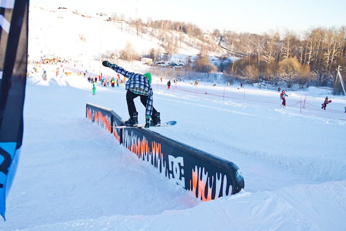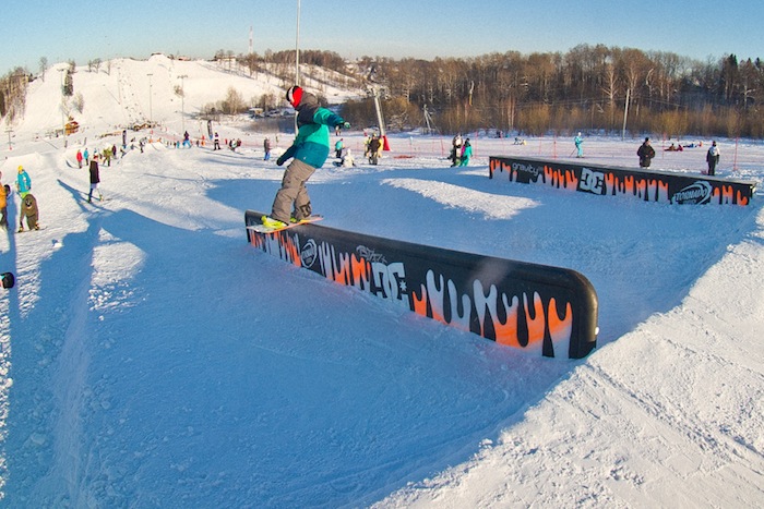 Ещё до открытия на склоне собралось множество желающих покататься самыми первыми в новом парке, а к началу фан-сессии это число увеличилось в 3 раза. Кстати, парк включает в себя джибовую (сверху вниз: Down rail-6 м, Flat box-6 м, Double kink rail-12 м, Bonk barrels, Uprail wallride-6 м, Dancefloor-4 м) и кикер-линии (сверху вниз: Kicker-4 м, Spine-4 м), а так же стритовую фигуру DC Metal Spot (double kink rail – 9м, Down rail – 9м).Бригада Moustache Crew постаралась на славу, идеально отшейпив все фигуры так, что кататься было одно удовольствие!