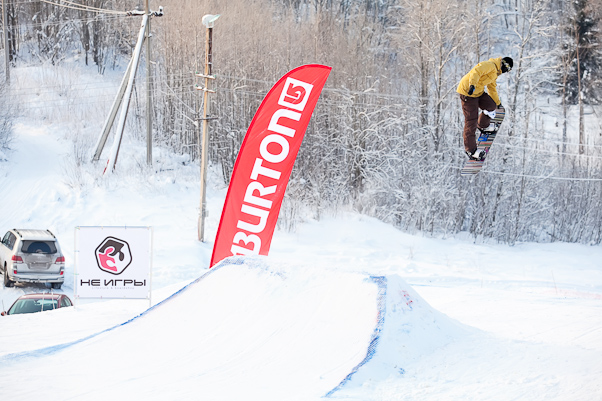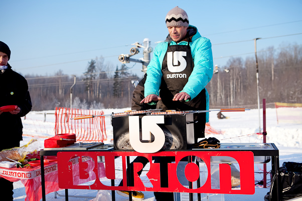 Ведущий соревнований Володя Кнаф постоянно подбадривал и веселил публику. На Burton-grill на протяжении всего дня поджаривались уже ставшие традиционной едой – наивкуснейшие хот-доги. Параллельно с контестом была открыта джиб-линия, которую можно было проверить на прочность и покатать по ней в свое удовольствие. Сам контест проводился всего на 3 фигурах – 2 кикерах и пирамиде. Специальный приз достался 10-летнему райдеру – Ване Юшкову за то, что он показал очень высокий