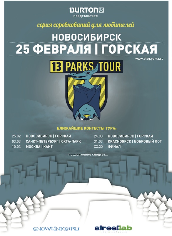 В субботу сноуборд-парк Burton будет работать только для участников соревнований. Новосибирское соревнование серии Ростелеком 13 Parks Tour пройдет в формате «слоуп-стайл». Вся серия ориентирована на любителей – в них может принять участие любой желающий, не являющийся