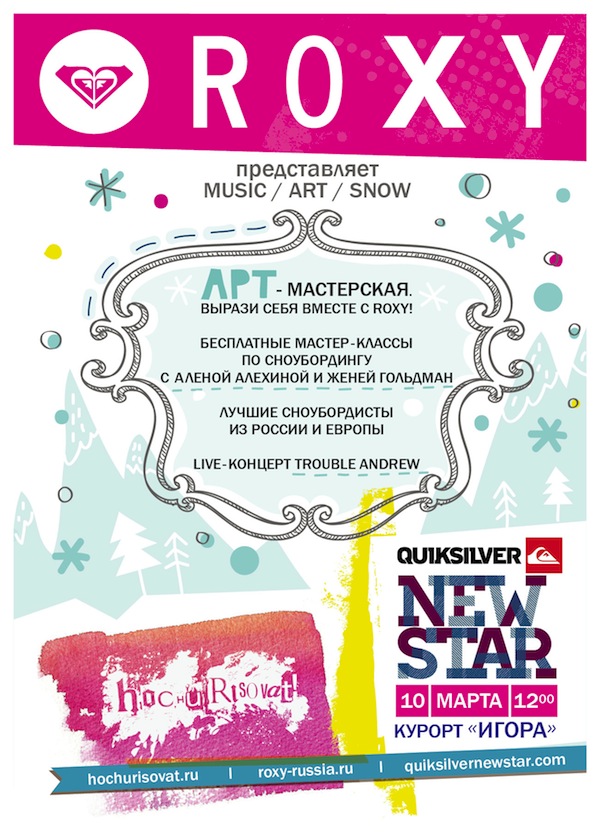 Также в течение всего дня, следуя модной тенденции в современном искусстве – «co-op» (совместное творчество), ты сможешь принять участие в оформлении ROXY Space и сделать для себя hand-made украшение из полимерной глины и войлока, вместе с художниками разработать и воплотить в жизнь сноуборд своей мечты.
