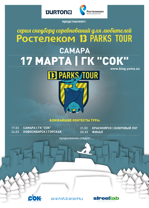 Спешим напомнить, что в Самаре в эти выходные, 17 марта (суббота), на территории ГК "СОК", пройдут уже девятые слоуп-стайл соревнования серии Ростелеком 13 Parks Tour! Как обычно, в соревнованиях смогут принять участие все желающие непрофессиональные райдеры.