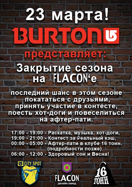 23 марта в 17:00 на Burton City Spot на “Флаконе” пройдет главное событие городского сноубординга, посвященное закрытию зимнего сезона.