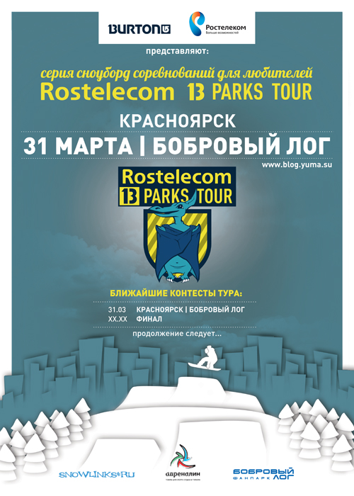 31 марта в Красноярске в фан-парке "Бобровый лог" пройдет очередной этап Ростелеком 13 Parks Tour в рамках большого спортивного фестиваля "Ростелеком Freestyle Fest 2012".