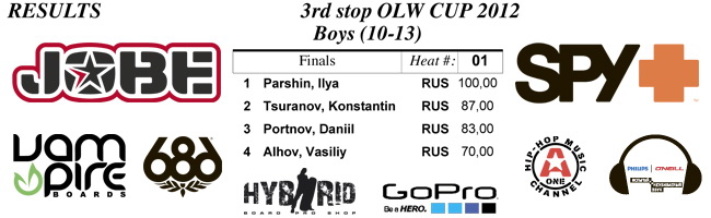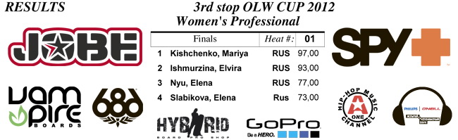 Третий этап Кубка в Санкт Петербургу определил победителей не только финального этапа, но и победителей по итогам всего Кубка ОЛВ 2012. На финальный этап 2012 года, собралось 56 спортсменов, которые боролись за звание лучшего ну и конечно за призы от компаний Jobe, Spy, 686, Vampire. За всем происходящим пристально следил видео партнер Кубка – камеры GoPro.