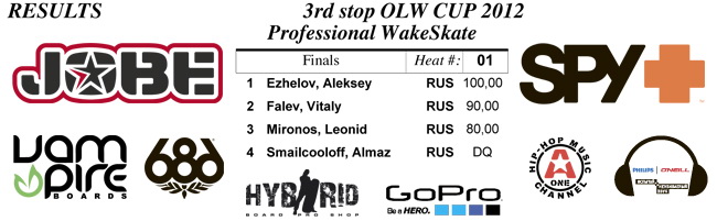 По итогам трех этапов, Кубок Открытой Лиги Вейкбординга 2012 года получили: Константин Цуранов (г.Санкт-Петербург) - категория Boys