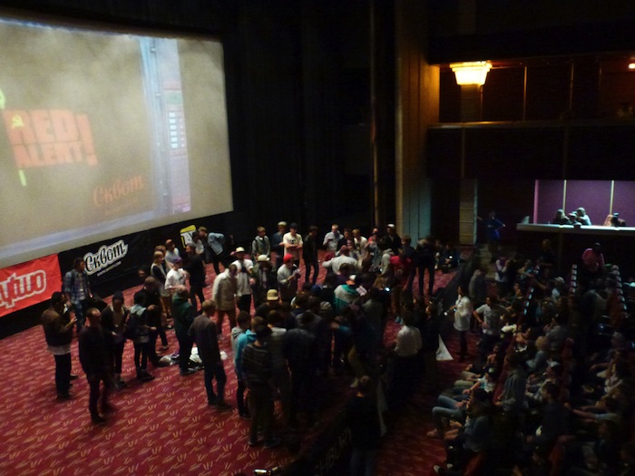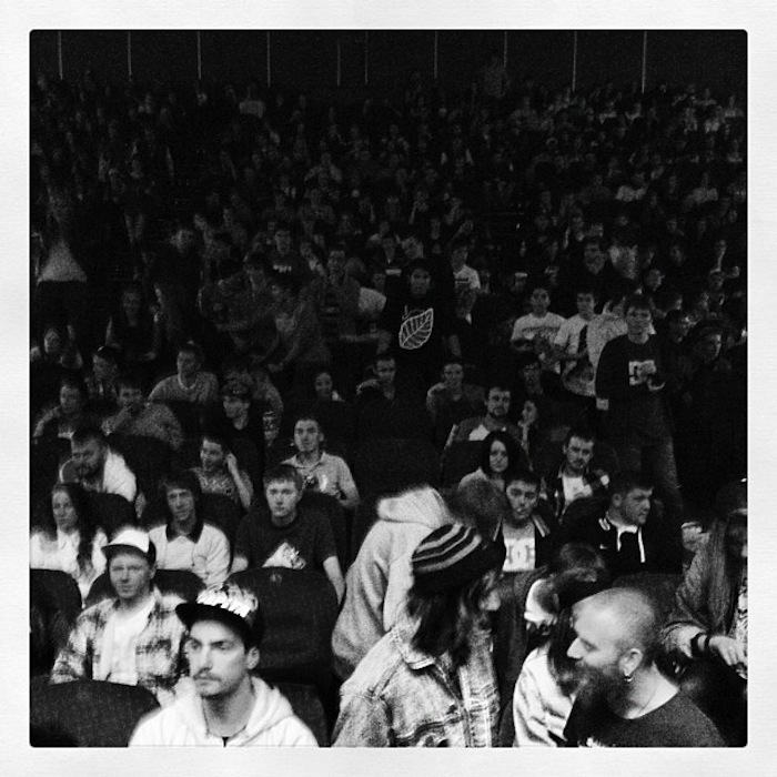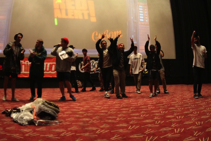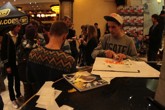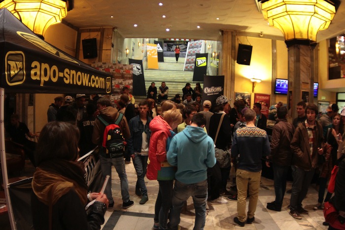 Сказать что на премьере были все – значит ничего не сказать! Количество гостей было такое, что мест в зале хватило далеко не всем! Армрестлинг за рюкзак Dakine, рваные футболки за наушники Philips, сальто за стаф от APO и Сквот бордшоп, маски Ashbury, летящие в зал в руки самым удачливым. Заполненная до отказа сцена, дым и шум на протяжении всего фильма, аплодисменты и свист! Все элементы “настоящей и правильной” премьеры были в тот день!